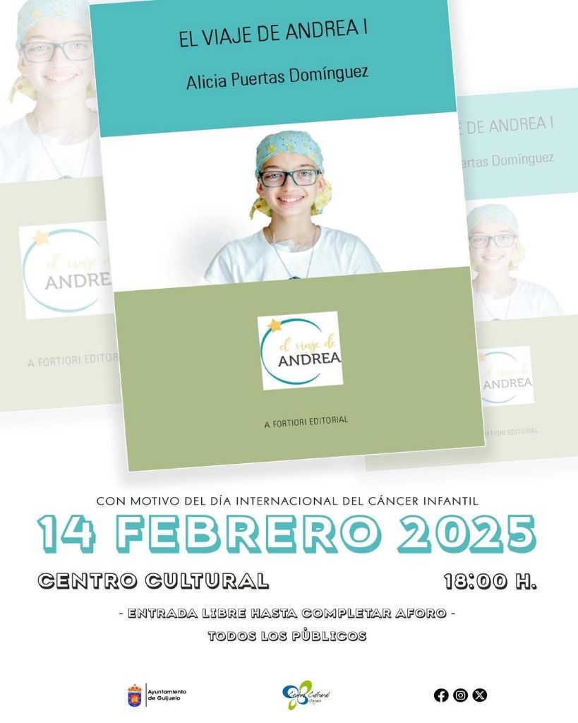 Alicia Puertas presentará ‘El viaje de Andrea’, en el Centro Cultural de Guijuelo este viernes, 14 de febrero, en el que se cuenta una historia real desde el punto de vista de una madre con una hija con cáncer infantil con un diagnóstico tardío y muchas preguntas sin resolver: ¿Qué falló? ¿Qué pasó?…