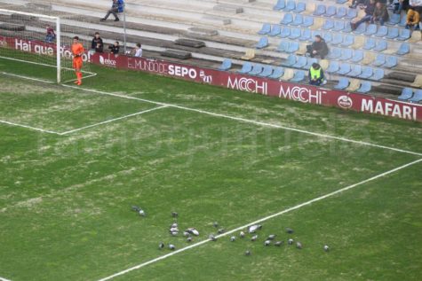 Una de las curiosidades del encuentro se dio especialmente en la primera mitad, el Guijuelo no pisaba el área rival y eran las palomas las que se asentaron sobre el terreno de juego, tranquilamente, disfrutando del césped de Pasaron.