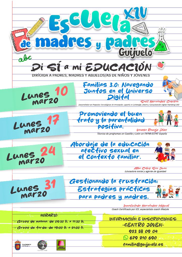 La XIV Escuela de Madres y Padres de Guijuelo comenzó este lunes con la primera de las cuatro sesiones: ‘Familias 3.0: navegando juntos en el universo digital’, impartido por el desarrollador de proyectos tecnológicos y experto en comunicación digital, Saúl Hernández, en la sala Polivalente del Ayuntamiento de Guijuelo.