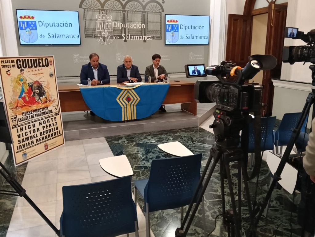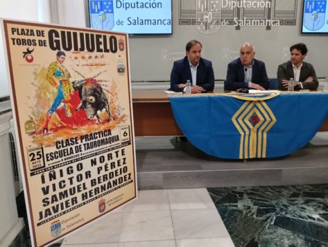 Jesús María Ortiz, diputado y delegado de la Escuela de Tauromaquia, junto a Roberto Martín, alcalde de Guijuelo y J. Ignacio Cascón, gerente de la plaza de Toros de Guijuelo, han presentado el evento que se celebrará el domingo, 25 de mayo a las 18 horas y que contará con un cartel formado por los alumnos de la Escuela: Íñigo Norte, Víctor Pérez, además de Samuel Berdejo y Javier Hernández.
