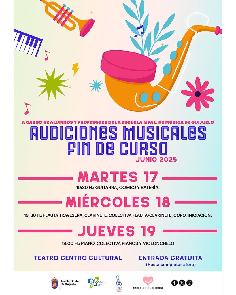 Por un lado, esta tarde, a partir de las siete, comenzarán las audiciones de final de curso de los alumnos y profesores de la Escuela de Música de Guijuelo y como es habitual, la cita se llevará a cabo en el Teatro del Centro Cultural. La entrada es libre hasta completar aforo. Este martes los alumnos de guitarra, combo y batería ofrecerán su recital, mientras que mañana miércoles será el turno de flauta travesera, clarinete, colectiva flauta, coro e iniciación. La última de las sesiones musicales, el jueves comenzará a las siete y media y actuarán los alumnos de piano, colectiva de piano y violonchelo.