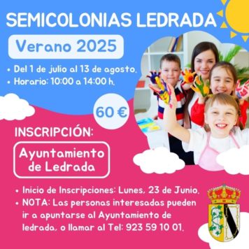 Por otro lado, y casi en las mismas fechas, del 1 de julio hasta el 13 de agosto las familias podrán contar con el programa de semicolonias en Ledrada. Hoy lunes se han abierto las inscripciones para la propuesta que tiene un precio único de 60€. En el consistorio de Ledrada y en el teléfono 923 59 10 01 les atienden por si necesitan más detalles del programa.