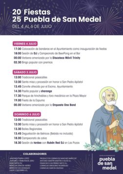 Estos días también se celebran las Fiestas de Puebla de San Medel en honor a San Pedro Apóstol con numerosas propuestas para todos los públicos. Hoy arrancan los festejos con tardeo, la colocación de banderas en el Ayuntamiento, verbena y bingo con sorpresas. El sábado y el domingo habrá pasacalles, eucaristía con procesión, paella, hinchables, además de fiesta de la espuma, verbenas y degustación de ibéricos.