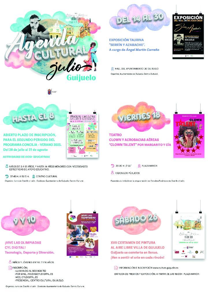 En este mes de julio los guijuelenses podrán disfrutar de propuestas variadas como las Olimpiadas CyL Digital que se celebrarán en el Centro Cultural los días 9 y 10 y que incluye tecnología, deporte y diversión y está destinado a niños entre 7 y 16 años.