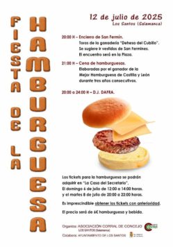 Por otra parte, en la Fiesta de la Hamburguesa de Los Santos habrá encierro de San Fermín, hamburguesas y sesión de dj y se celebra este sábado día 12. El precio de cada hamburguesa + bebida es de 6€.