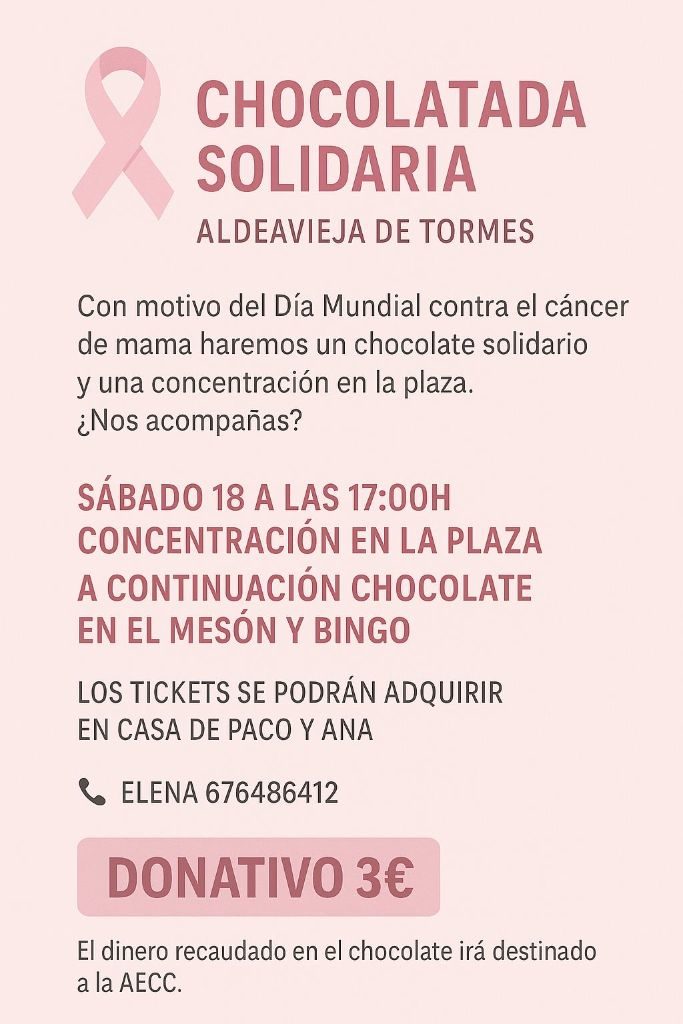 En Aldeavieja este sábado celebrará una nueva edición de su chocolatada a favor de la aecc. A partir de las 17h animan a sus vecinos a participar en la concentración que se llevará a cabo en la plaza y después degustar un chocolate, además de jugar al bingo. El precio es de 3€ y los tickets se pueden adquirir en casa de Paco y Ana y también por teléfono, en el 676 48 64 12.