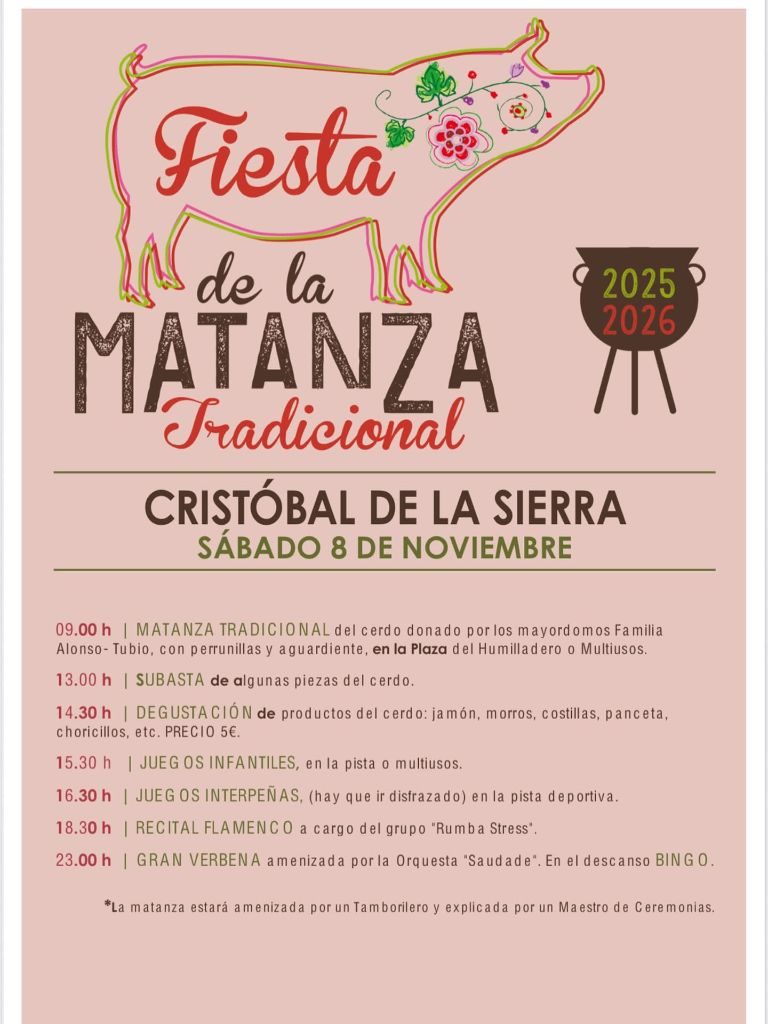 En relación a la Matanza, se celebrará el sábado desde las 9 de la mañana y el programa incluye la subasta de piezas del cerdo, degustación de productos, juegos infantiles y la verbena con la orquesta Saudade.