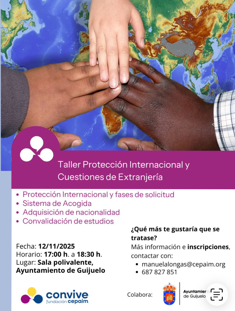 Este miércoles, 12 de noviembre, se impartirá el taller ‘Protección Internacional y cuestiones de extranjería’ en la sala Polivalente del Ayuntamiento de Guijuelo, a cargo de la fundación Convive Cepaim en colaboración con el consistorio guijuelense.