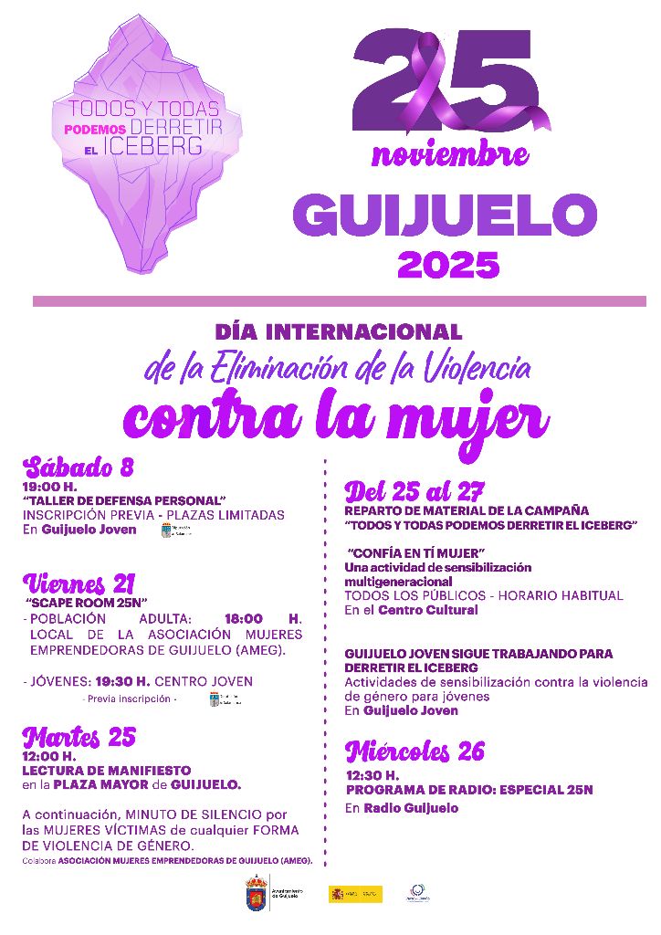 El 25 de noviembre se conmemora el Día de la Eliminación de la Violencia contra la mujer y desde la concejalía de Igualdad se ha presentado un programa que se llevará a cabo en diferentes entornos de Guijuelo.
