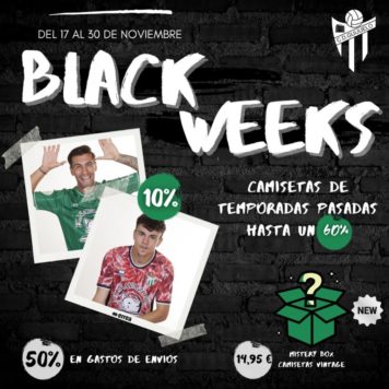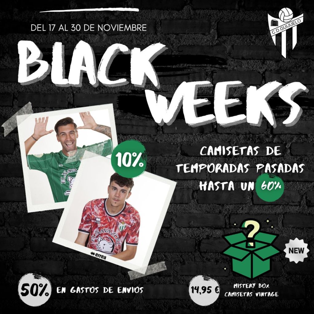 Hasta el 30 de noviembre podrás disfrutar de diferentes descuentos en la ropa oficial del C.D. Guijuelo. Llega la Black Weeks con un 10% de descuento en todas las camisetas oficiales de esta temporada, es decir pueden conseguir la primera o segunda equipación por 39.95 euros.