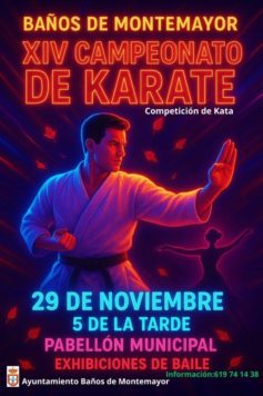El Complejo Deportivo ‘José Manuel Calderón’ de Baños de Montemayor acoge este sábado 29 de noviembre a partir de las cinco de la tarde el XIV Campeonato de Karate en las diciplinas de kata y kumite.