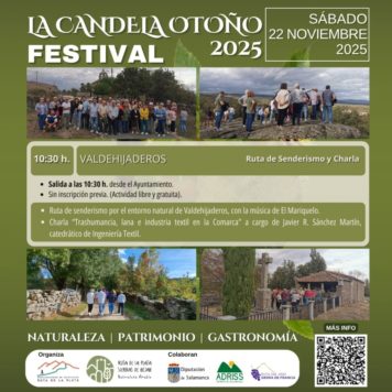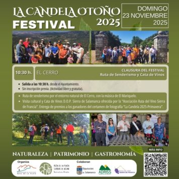 Y para completar el fin de semana el domingo se celebrará la última de las jornadas del festival, la de El Cerro con ruta de senderismo por el entorno natural del Cerro, música tradicional, visita cultural, además de una cata de vino DOP Sierra de Salamanca, ofrecida por la asociación Ruta del Vino Sierra de Francia y la entrega de premios a los ganadores del certamen de fotografía La Candela Primavera 2025.