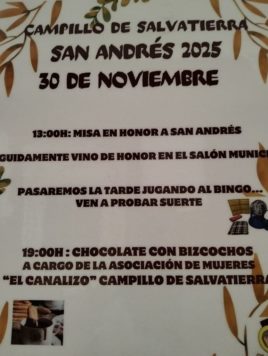 Comenzamos por San Andrés que se celebra este domingo en Campillo. Los vecinos de la Entidad Local Menor se reunirán para honrar al santo con una eucaristía, se ofrecerá un vino de honor en el salón municipal y por la tarde, además de bingo también se degustará un chocolate con bizcochos, a cargo de la asociación de mujeres El Canalizo de Campillo.