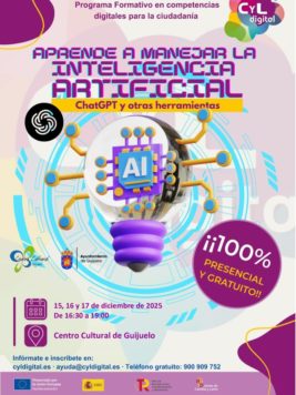 Los días 15, 16 y 17 de diciembre, es decir, lunes, martes y miércoles de la próxima semana, en el Centro Cultural de Guijuelo se impartirá una nueva formación presencial y gratuita sobre IA.