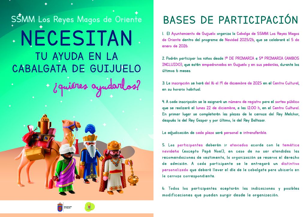 Los niños de 1º a 5º de Primaria ya pueden inscribirse para poder participar en la Cabalgata de Reyes, que, como es habitual recorrerá las calles de Guijuelo y sus pedanías, el día 5 de enero. Los interesados deben acudir al Centro Cultural hasta el día 19 y el lunes,22 de diciembre, se llevará a cabo el sorteo entre todos los participantes, a las doce del mediodía, en el Centro Cultural.