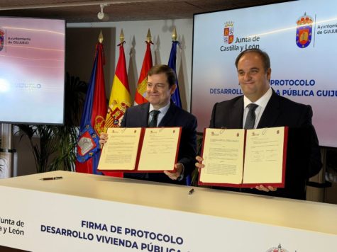 El presidente de la Junta de Castilla y León, Alfonso Fernández Mañueco y el alcalde de Guijuelo, Roberto Martín, han firmado el convenio que permitirá la construcción de 44 viviendas de protección oficial en la Bajada de las Piscinas.