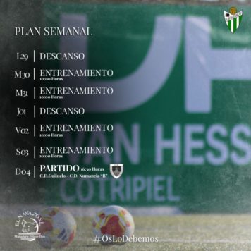 El plan semanal de preparación del primer partido del año cuenta con una sesión el martes 30 y el miércoles 31, mientras que el día de año nuevo será de descanso. Para completar la semana contarán con dos sesiones más, una el viernes y otra el sábado, para afrontar el partido ante el Numancia B previsto para las cuatro y media de la tarde del próximo domingo.