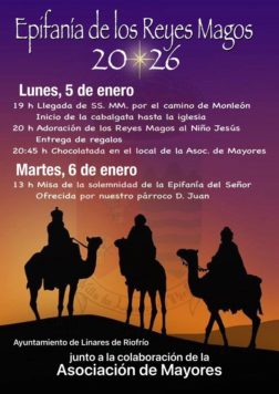 En Linares se ha organizado la llegada de los tres reyes desde las 19h por el camino de Monleón, se llevará a cabo la adoración al Niño Jesús, entrega de regalos y chocolatada en el local de la asociación de mayores. Y mañana día 6, misa desde las 13 horas.