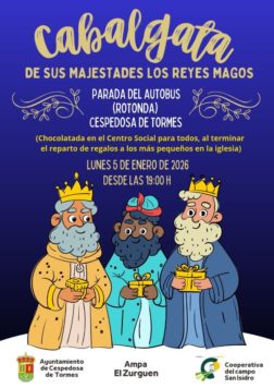 A las 19h en la parada del autobús de Cespedosa comenzará la Cabalgata de Reyes y después se ofrecerá un chocolate caliente en el Centro Social que completará el reparto de regalos.