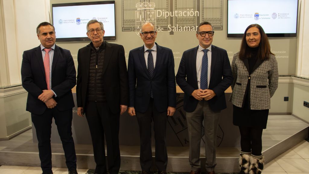 El presidente de la Diputación de Salamanca, Javier Iglesias, y los rectores de la Universidad de Salamanca, Juan Manuel Corchado, y de la Universidad Pontificia, Santiago García-Jalón, han presentado una nueva edición del Plan de Empleo Juvenil Universitario, una iniciativa conjunta destinada a facilitar la primera experiencia profesional de jóvenes egresados de ambas instituciones académicas en municipios de la provincia con menos de 20.000 habitantes.