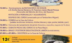 En Sorihuela, este sábado la plaza Mayor acoge la V Matanza Típica, que arrancará a las 12 con el nombramiento de los matanceros de honor. Después habrá comida de matanza, concurso de lanzamiento de jamón, subasta de las piezas del cerdo, bingo, degustación de jamón y discoteca, en la Casa de Cultura.