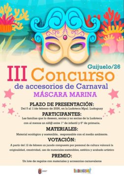 La Ludoteca Lodoguay ha abierto el plazo de la tercera edición del concurso de accesorios de Carnaval ‘Máscara Marina’, destinado a familias con niños en edad escolar entre 1º de Infantil y 6º de Primaria, sean socios o no socios de la Ludoteca.