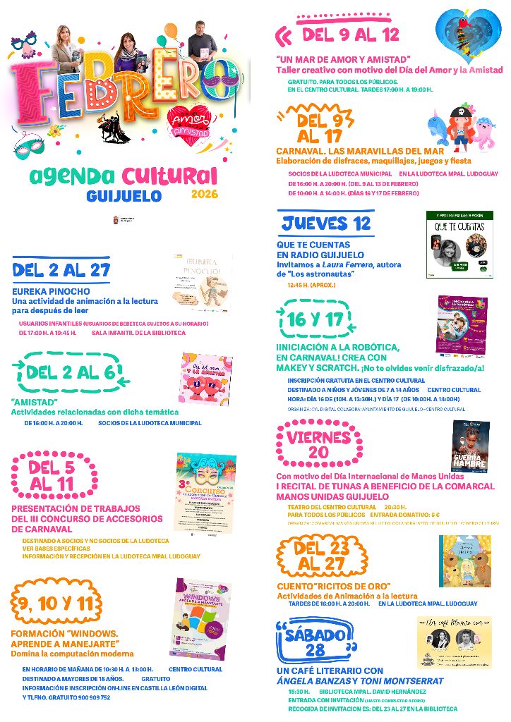La agenda de propuestas culturales para este mes de febrero nos deja muchas citas, desde las relacionadas con el Carnaval, las de los libros y la animación a la lectura, así como un recital solidario de tunas a beneficio de la Comarcal de Manos Unidas, que se llevará a cabo el viernes 20, con motivo del Día Internacional de Manos Unidas.