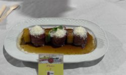 Mercedes Sánchez elaboró el plato ‘Solomillo de cerdo ibérico con bacon, piña y salsa de amaretto’, que con 257 puntos, se llevó el segundo puesto y recibió una paleta donada por Casa Cheti y dos botellas de vino de Pinhel.
