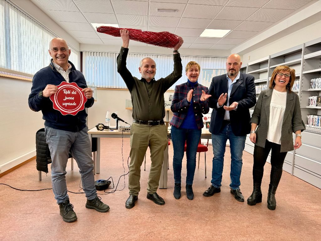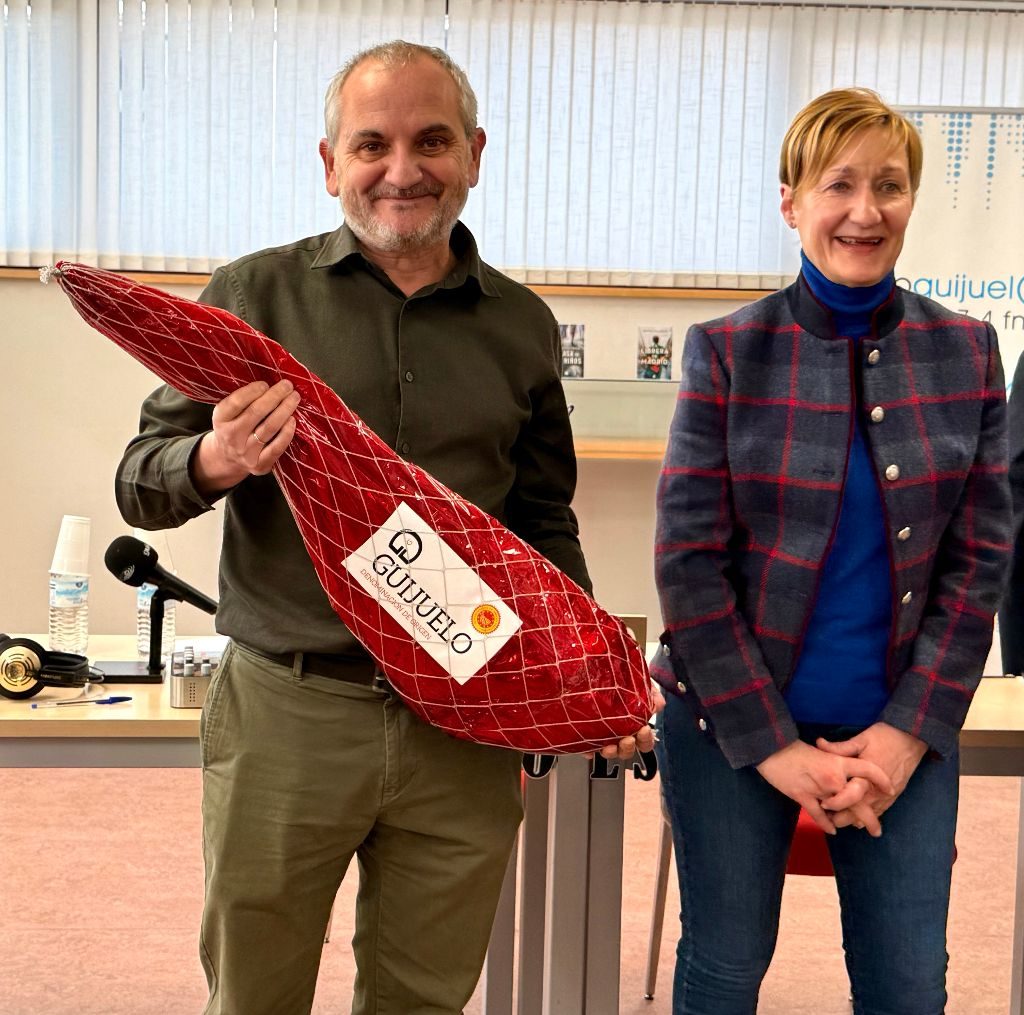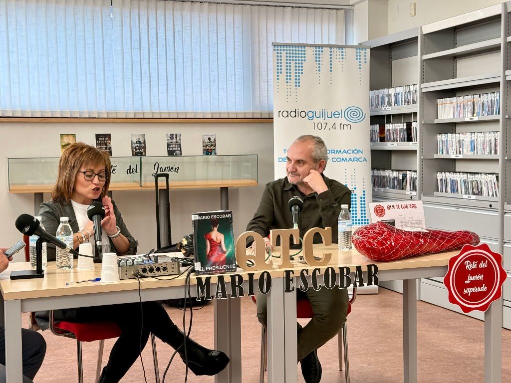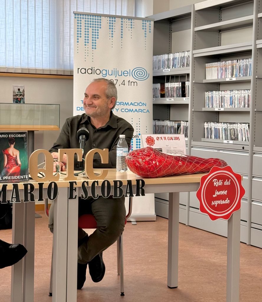 El escritor Mario Escobar visitó en la tarde de ayer nuestro municipio para recoger su premio tras completar el Reto del Jamón. La cita literaria se llevó a cabo en la Biblioteca Municipal en la que el Ayuntamiento de Guijuelo, a través de la teniente de Alcalde, Yolanda Alonso, le entregó un jamón DOP Guijuelo, dentro de la colaboración del Consistorio guijuelense con la Denominación de Origen.