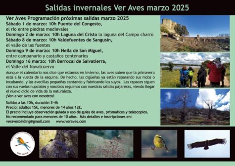 También este fin de semana se iniciará el programa de marzo de Ver Aves con una salida para avistar aves en Puente del Congosto. La cita se llevará a cabo el sábado, desde las 10 de la mañana y está destinada a mayores de 10 años, tiene un precio de 15€ para los adultos y 12€, para los menores de 14 años y si quieren conocer más destalles del evento, pueden consultar la web www.veraves.com y en veravesbirding@gmail.com