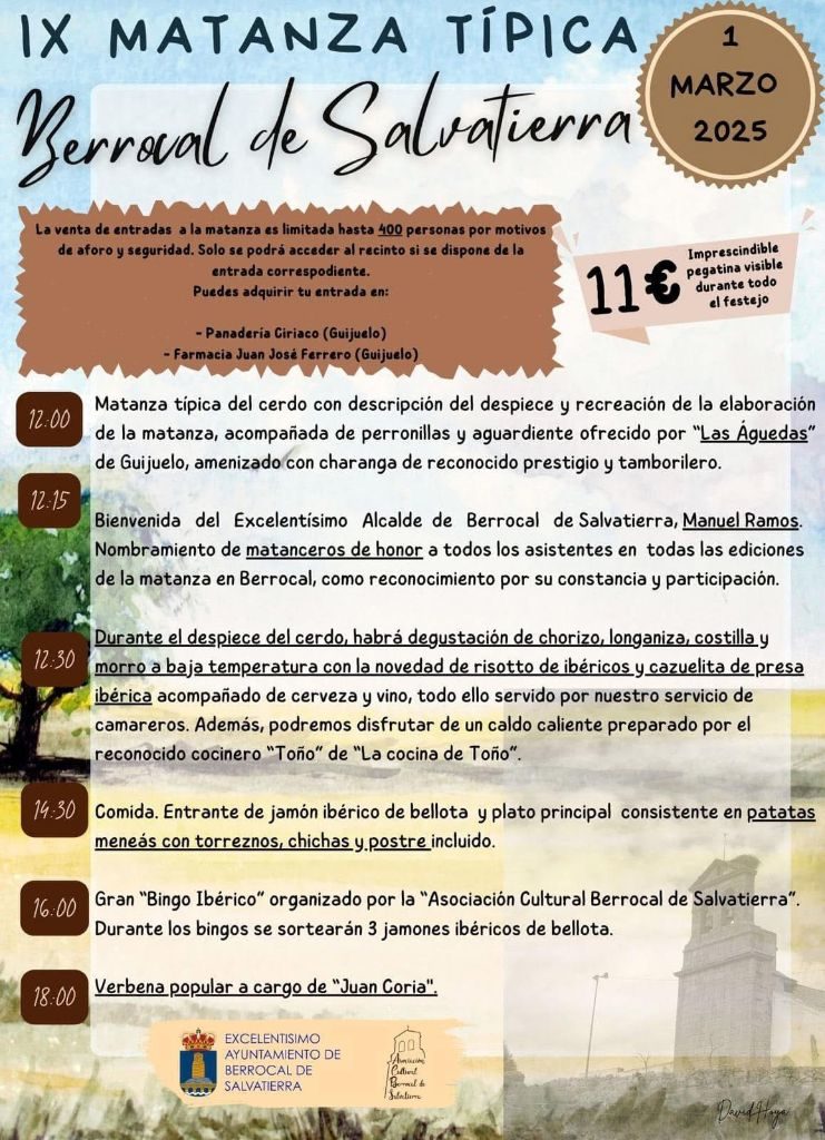 Repasamos las actividades para este finde que no están relacionadas con el Carnaval, como las matanzas en tres municipios de nuestra Comarca. Berrocal celebra su Matanza y lo hará a partir de las doce del mediodía con el tradicional rito matancero, la degustación de las perrunillas y aguardiente, con la colaboración de Las Águedas y los matarifes de Guijuelo. Tras la comida, a base de entrantes ibéricos y patatas meneás con torreznos y chichas, los participantes jugarán al bingo ibérico y disfrutarán de la verbena popular.