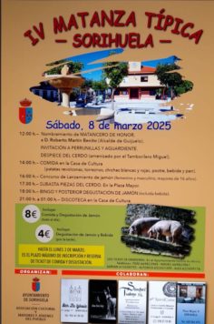 El próximo sábado, 8 de marzo, Sorihuela honrará al cerdo ibérico con su IV fiesta de la Matanza, organizada por el Ayuntamiento de Sorihuela, en colaboración con la asociación cultural y la asociación de mayores y jóvenes del pueblo.