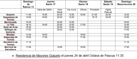 Este Jueves Santo, la Iglesia de Nuestra Señora de la Asunción de Guijuelo acogerá la Cena del Señor a las 19:00h y la Hora Santa desde las 22:00h. Además, este Viernes Santo se celebrará el Vía Crucis a las 12:00h, los Oficios desde las 18:00h y la Procesión a partir de las 21:00h. El programa se completará con la Vigilia Pascual del sábado a las 22:00 horas y la misa por el Domingo de Resurrección a las 12:00h horas.