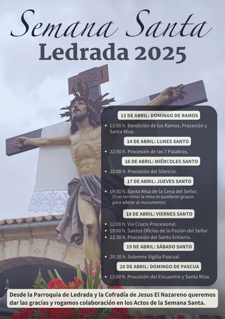 En la Comarca se han organizado diversos programas por la Semana Santa como en Ledrada, donde los vecinos podrán asistir a las eucaristías y hasta el domingo, algunas de ellas incluyen procesiones como la del Silencio de hoy miércoles por la noche, la del Santo Entierro del viernes y la del Encuentro del Domingo de Pascua.