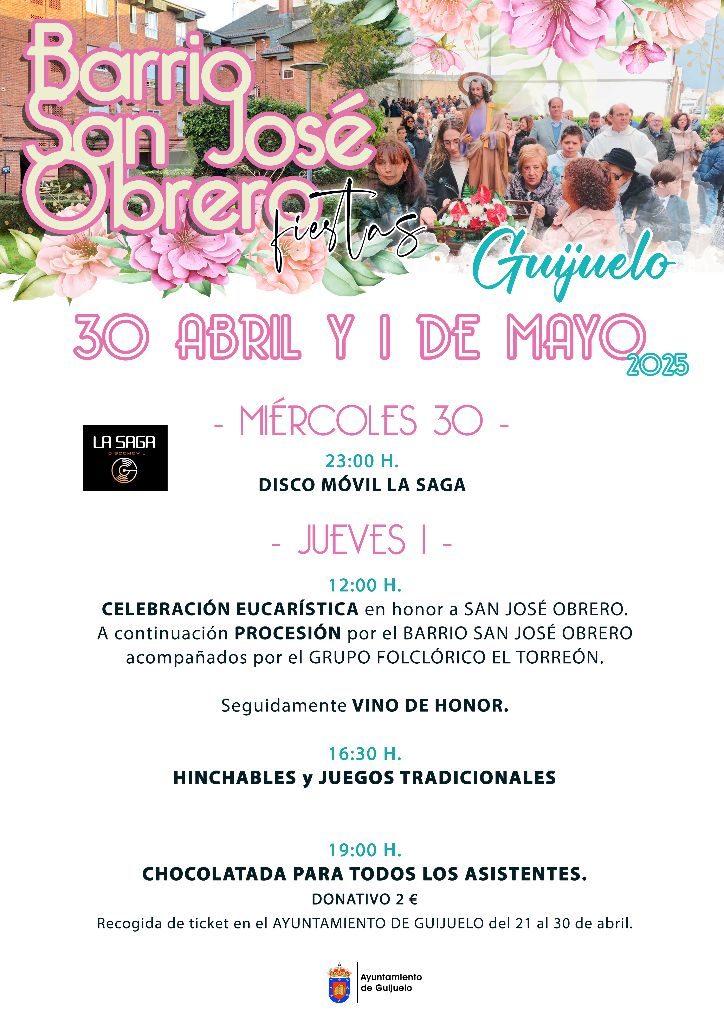 Las citas arrancarán el miércoles 30 de abril a las once de la noche con la disco móvil ‘La Saga’ que se llevará a cabo en la carpa que se instalará para la celebración. El jueves a las doce se celebrará la eucaristía en honor a San José Obrero, a la que seguirá una procesión por las calles del barrio, con la participación del grupo folclórico El Torreón. La mañana concluirá con un vino de honor. Por la tarde, a las cuatro y media arrancará una jornada de hinchables y juegos tradicionales y a las siete se ofrecerá una chocolatada, con un donativo de 2€, cuya recaudación se destinará en beneficio del barrio. Los tickets para la chocolatada se pueden recoger en el Ayuntamiento, hasta el próximo 30 de abril.