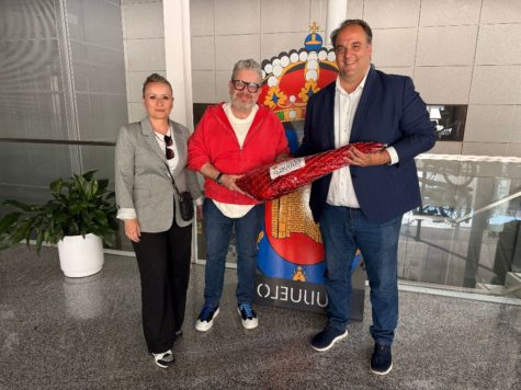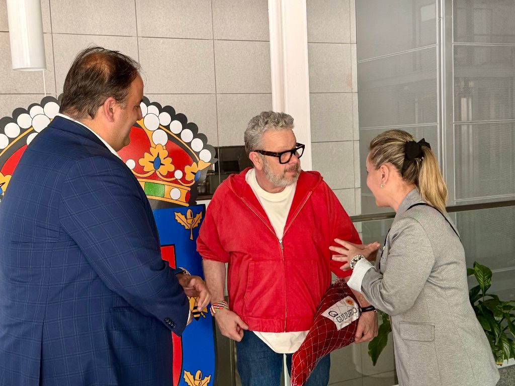 El alcalde de Guijuelo, Roberto Martín y la concejala de Hostelería y Turismo, Sandra Méndez, han recibido en el Ayuntamiento de Guijuelo al chef, Alberto Chicote, a su paso por Guijuelo y para que se lleve un recuerdo del municipio, ambos han entregado a Chicote un jamón ibérico de Guijuelo.