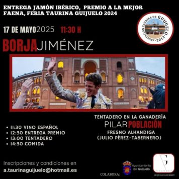 El sábado, 17 de mayo se desplazarán hasta la finca de Julio Pérez-Tabernero en Fresno donde entregarán el premio a la mejor faena en la pasada Feria Taurina de Guijuelo a Borja Jiménez.