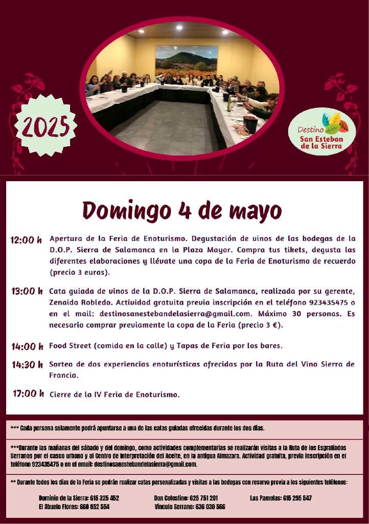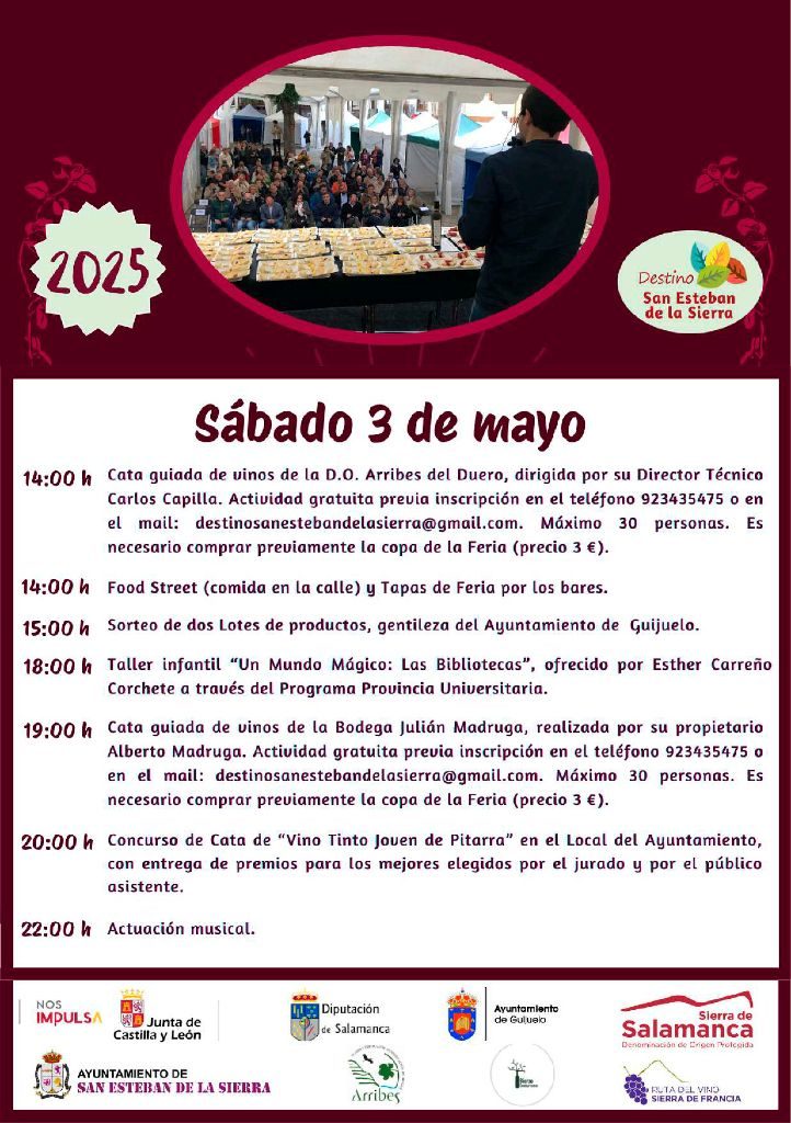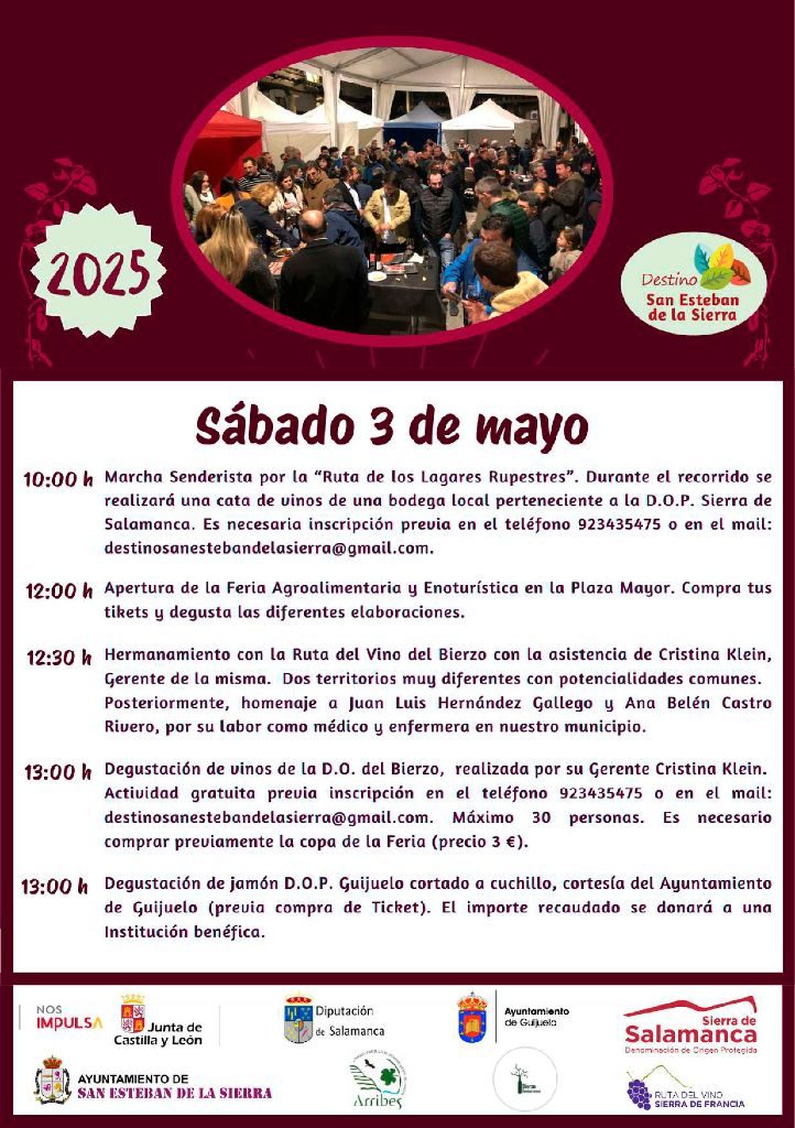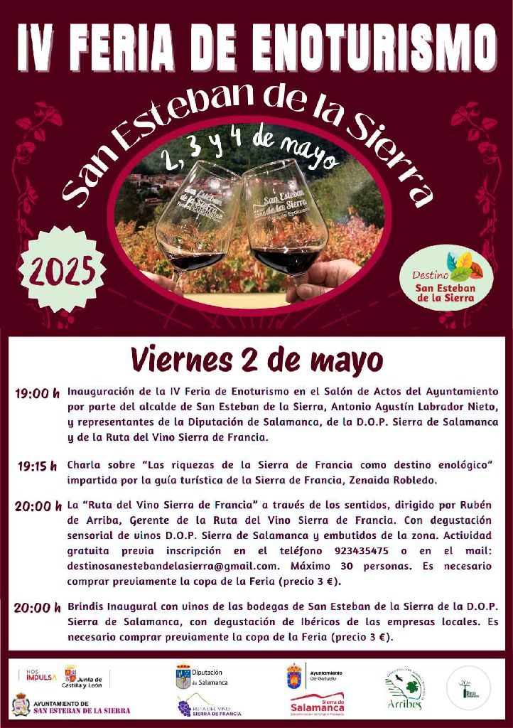 Por un lado, destaca la IV Feria de Enoturismo de San Esteban de la Sierra que se inaugura esta misma tarde. El alcalde de Guijuelo, Roberto Martín, se acercará hasta el municipio para acompañar a los vecinos en su feria. La jornada inaugural se llevará a cabo desde las siete en el salón del Consistorio de la localidad y contará con representantes de Diputación, DOP Sierra de Salamanca y de la Ruta del Vino de la Sierra.