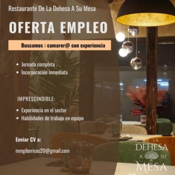 Y, por otra parte, el restaurante De La Dehesa a su mesa busca camareros para trabajar a jornada completa y con incorporación inmediata.