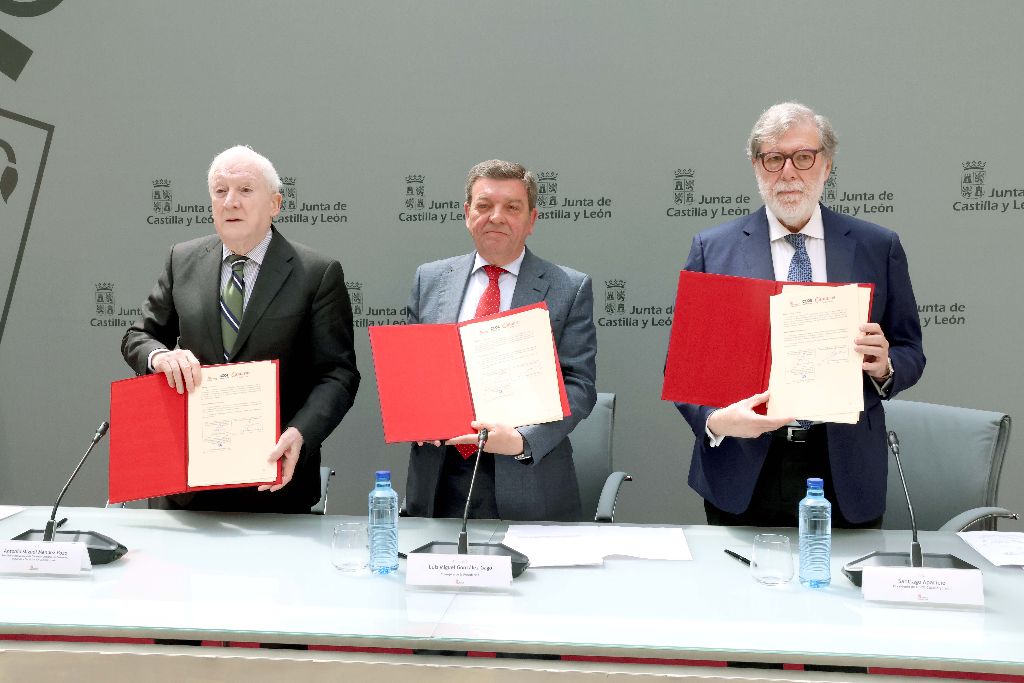 El consejero de la Presidencia, Luis Miguel González, ha firmado este nuevo convenio de colaboración con los presidentes del Consejo de Cámaras de Comercio de Castilla y León, Antonio Miguel y de la CEOE CyL, Santiago Aparicio.