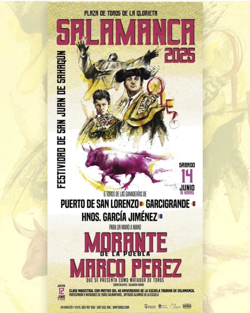 Y, por último, el sábado a las seis de la tarde en La Glorieta se presenta como matador Marco Pérez, acompañado por Morante de la Puebla, que lidiarán seis toros de la ganadería de Puerto de San Lorenzo, Garcigrande y Hermanos García Jiménez.