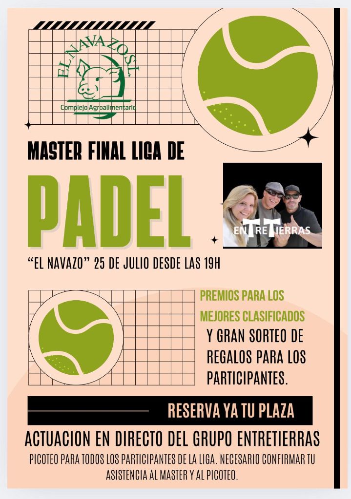 El próximo viernes 25 de julio desde las 19:00h, en el club guijuelense de tenis y pádel pondrán el broche final a la temporada con la celebración del Máster final de la I liga ‘El Navazo’, con premios para los primeros clasificados, sorteo de regalos, picoteo y música en directo con la actuación del grupo Entretierras.