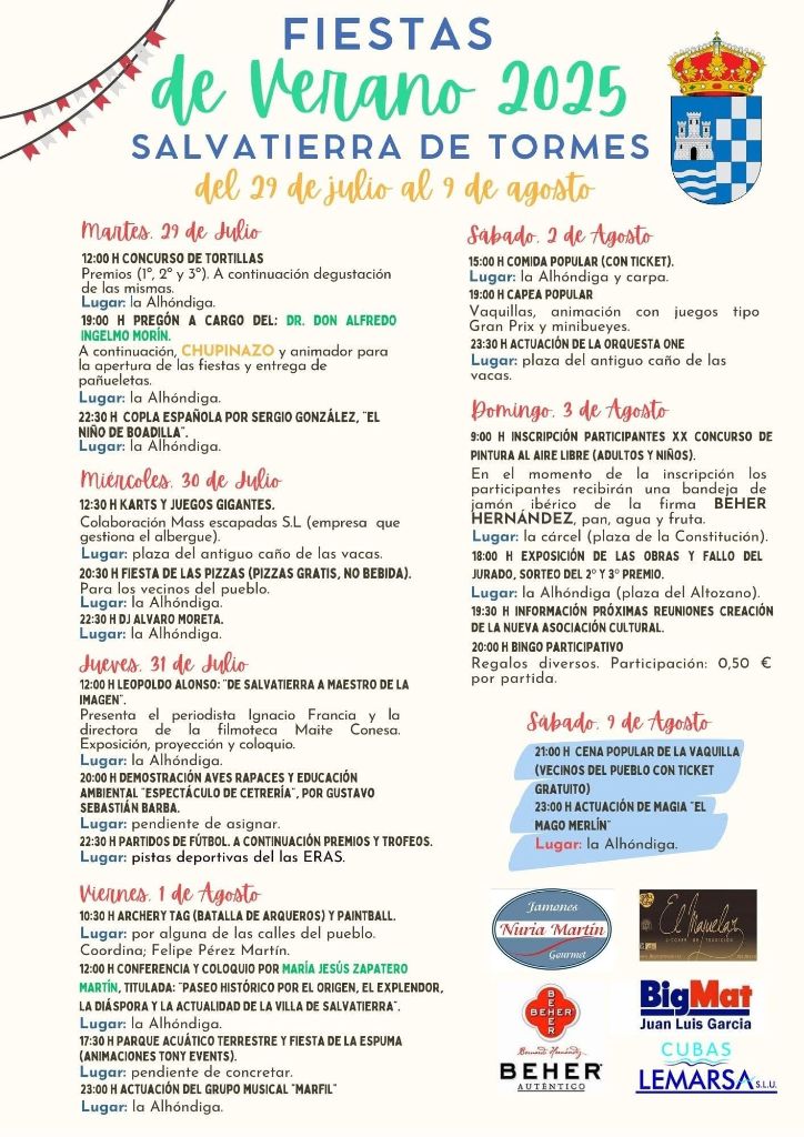 Los actos festivos incluyen karts y juegos gigantes, la fiesta de las pizzas, sesión de dj, además de la exposición ‘De Salvatierra a maestro de la imagen’. Despedirán el mes de julio con un espectáculo de cetrería y las finales de los partidos de fútbol.