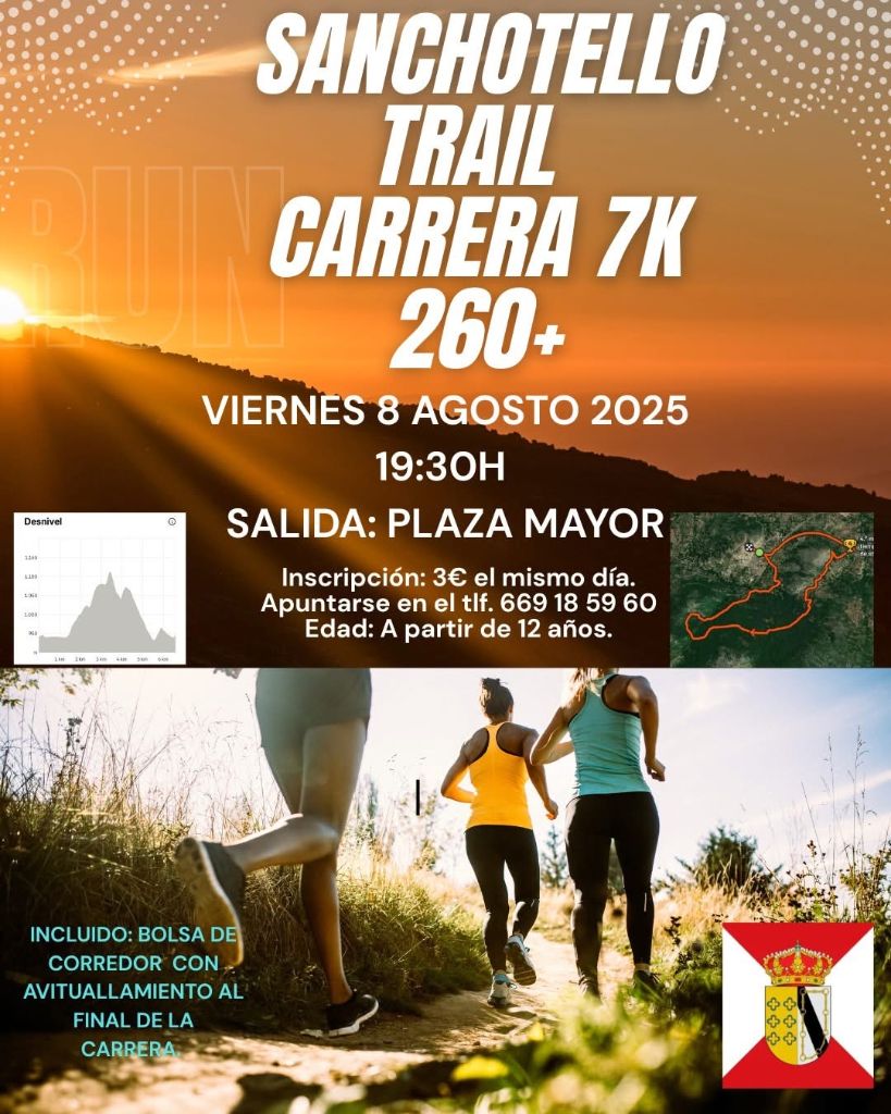 El viernes a las siete y media de la tarde desde la plaza Mayor de Sanchotello se dará salida a la primera edición del Trail de Sanchotello, carrera de 7 km con un desnivel de 260 metros positivos.