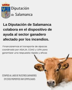 La Diputación de Salamanca colaborará en el dispositivo especial impulsado por las organizaciones agrarias para auxiliar a los ganaderos de la provincia que se han visto afectados por los incendios forestales que en los últimos días han devastado varias zonas de la provincia.