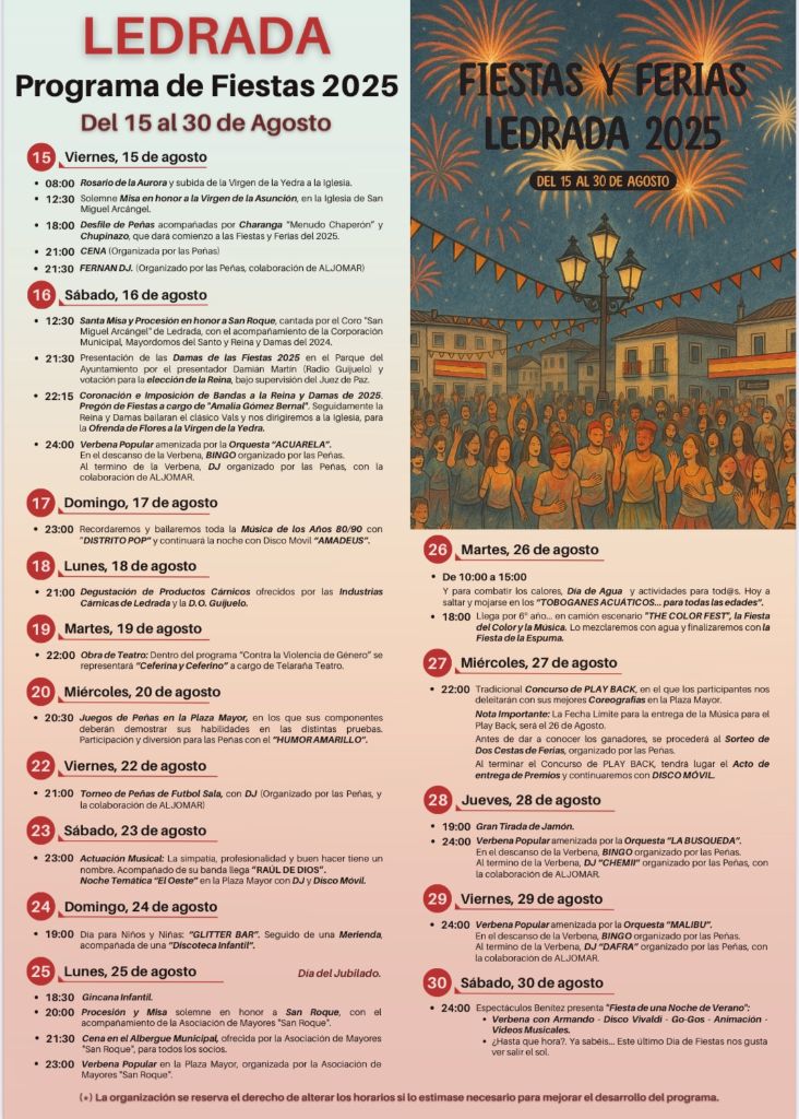 Por su parte, en Ledrada hoy celebran su torneo de fútbol sala, mientras que mañana a las 23:00h disfrutarán de la actuación musical de Raúl de Dios, además de una noche temática del oeste con dj y disco móvil. El domingo será un día para los más pequeños, que podrán disfrutar de un glitter bar, seguido de una merienda y una discoteca infantil.
