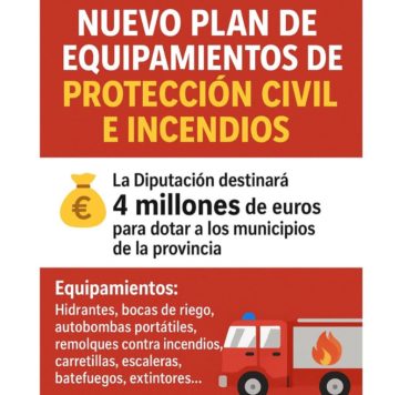 Con una inversión de 4 millones de euros el plan dotará a los ayuntamientos de material esencial contra los incendios y para la protección civil. Consiste en subvenciones en concurrencia competitiva, hasta 15.000€ por municipios y hasta 25.000€ para aquellas localidades del grupo 1, con mayor riesgo de incendios. Los Ayuntamientos aportarán un 20% del presupuesto, mientras que, la Diputación adelantará el dinero para facilitar las compras: bocas de riego, autobombas portátiles, además de carretillas y extintores, entre otros elementos.