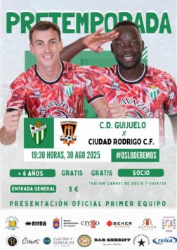 Este sábado finaliza la pretemporada para el C.D. Guijuelo con el encuentro de presentación oficial del primer equipo ante el Ciudad Rodrigo de Regional de Aficionados. La cita será el sábado, a las siete y media de la tarde en el Municipal Luis Ramos. Los socios accederán al campo de manera gratuita con el carnet de este curso o con el carnet de socio de la temporada 24-25, para los menores de seis años, la entrada también es gratuita, mientras que el resto de aficionados tendrán que abonar cinco euros.