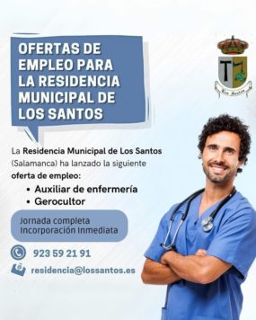 Por ejemplo, desde la residencia de mayores de Los Santos han lanzado dos ofertas de empleo: como auxiliar de enfermería y como gerocultor. Ambos perfiles con incorporación inmediata y para trabajar a jornada completa.