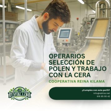 Se necesitan operarios de selección de polen y trabajo con la cera para sumarse a la cooperativa Reina Kilama, por lo que, si están interesados pueden llamar al 616 65 00 42 ó contactar por correo electrónico en info@adriss.net